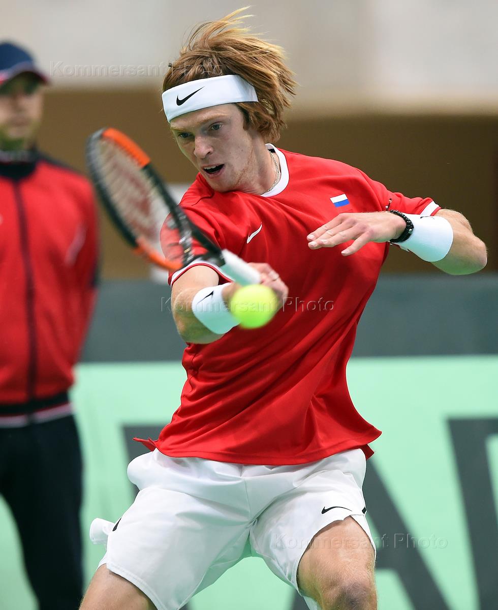 Кубок Дэвиса. День первый. Группа I (зона Европа/Африка) командного чемпионата мира между мужскими сборными командами России и Австрии. Игрок сборной России Андрей Рублев во время матча против игрока сборной Австрии Денниса Новака на Малой спортивной арене спортивного комплекса "Лужники".