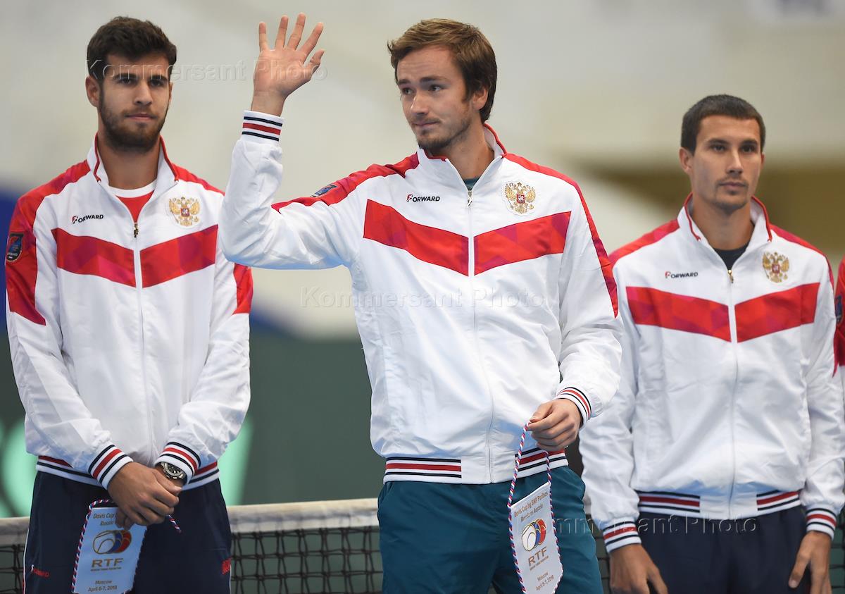 Кубок Дэвиса. День первый. Группа I (зона Европа/Африка) командного чемпионата мира между мужскими сборными командами России и Австрии. Слева направо, игроки сборной России: Карен Хачанов, Даниил Медведев и Евгений Донской перед началом матча на Малой спортивной арене спортивного комплекса "Лужники".