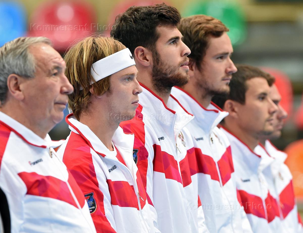 Кубок Дэвиса. День первый. Группа I (зона Европа/Африка) командного чемпионата мира между мужскими сборными командами России и Австрии. Президент Федерации тенниса России Шамиль Тарпищев (слева) и игрок сборной России Андрей Рублев (справа) во время матча против игрока сборной Австрии Денниса Новака на Малой спортивной арене спортивного комплекса "Лужники".