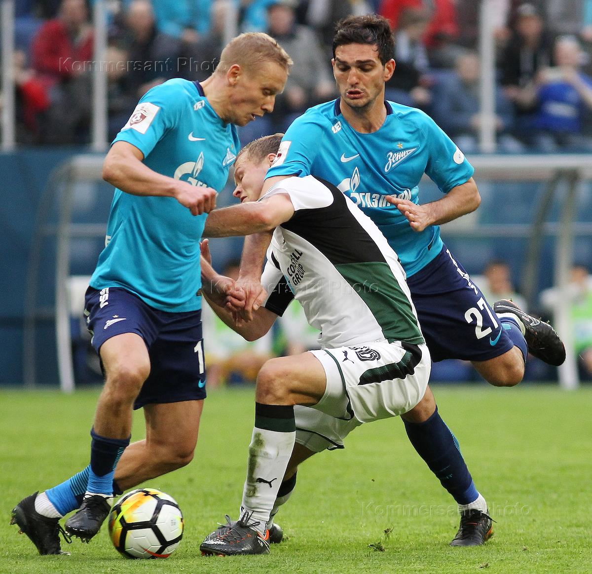 Российская премьер-лига. 25-го тур. Матч между командами "Зенит" (Санкт-Петербург) и Краснодар (Краснодар) прошел на стадионе "Санкт-Петербург". Игрок команды "Зенит" Магомед Озгоев (слева) и игрок команды "Краснодар" Виктор Классон (в центре) во время матча.