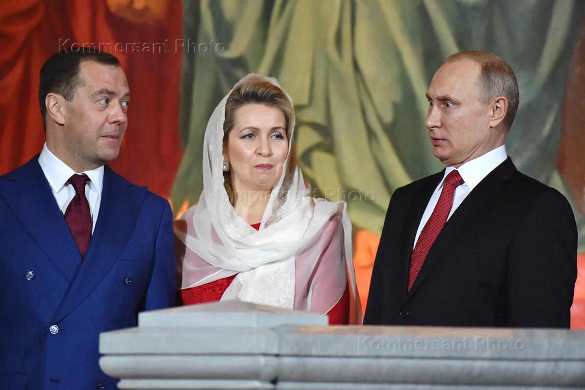 Пасхальная заутреня и Божественная литургия в кафедральном соборном храме Христа Спасителя. Слева направо: председатель Правительства России Дмитрий Медведев, супруга председателя правительства Дмитрия Медведева Светлана Медведева и президент России Владимир Путин во время богослужения.