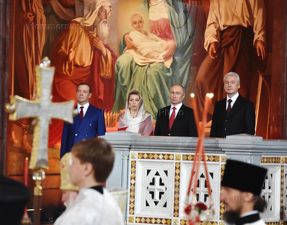 Пасхальная заутреня и Божественная литургия в кафедральном соборном храме Христа Спасителя. Слева направо: супруга председателя правительства Дмитрия Медведева Светлана Медведева, президент России Владимир Путин и мэр Москвы Сергей Собянин во время богослужения.