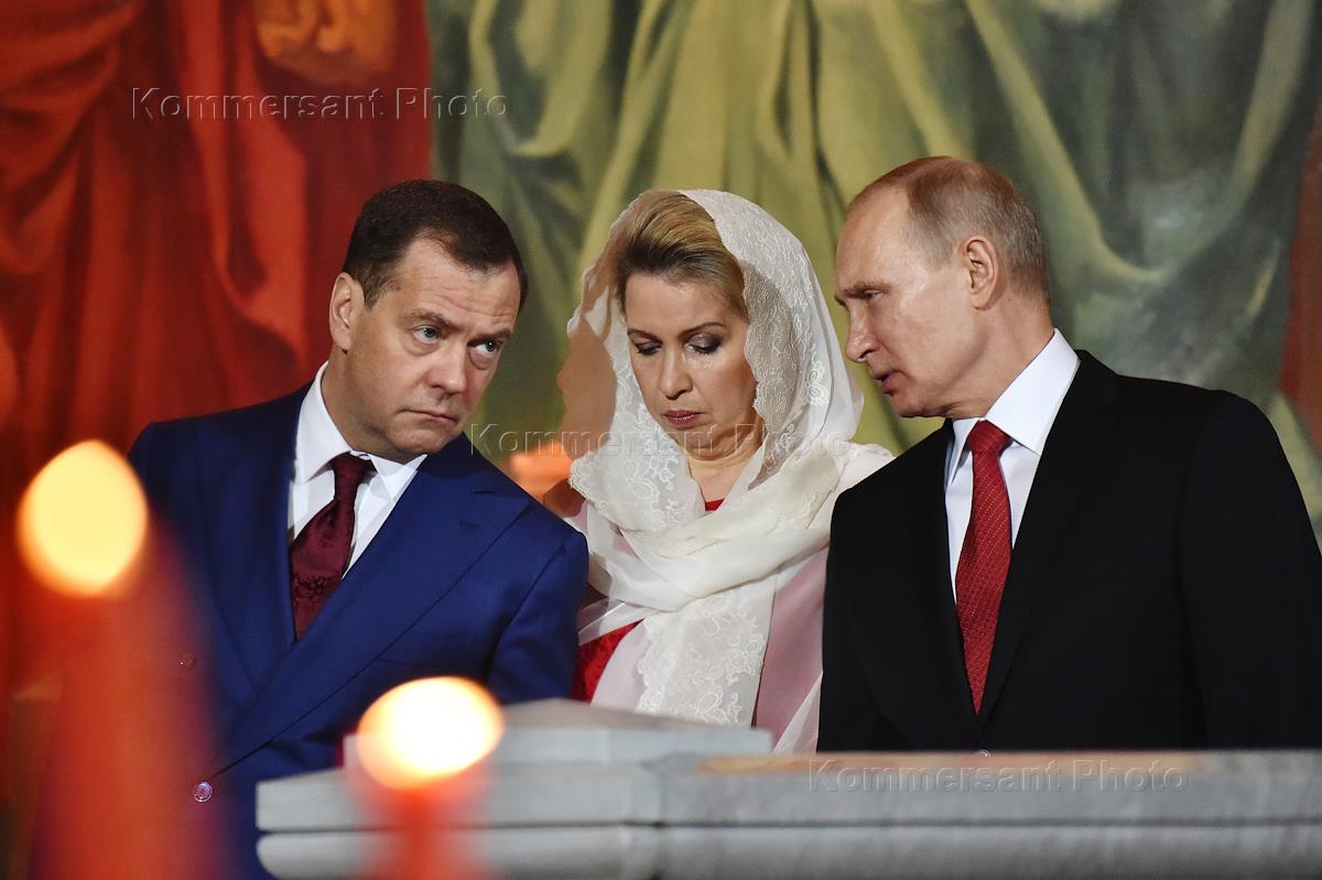 Пасхальная заутреня и Божественная литургия в кафедральном соборном храме Христа Спасителя. Слева направо: председатель Правительства России Дмитрий Медведев, супруга председателя правительства Дмитрия Медведева Светлана Медведева и президент России Владимир Путин во время богослужения.