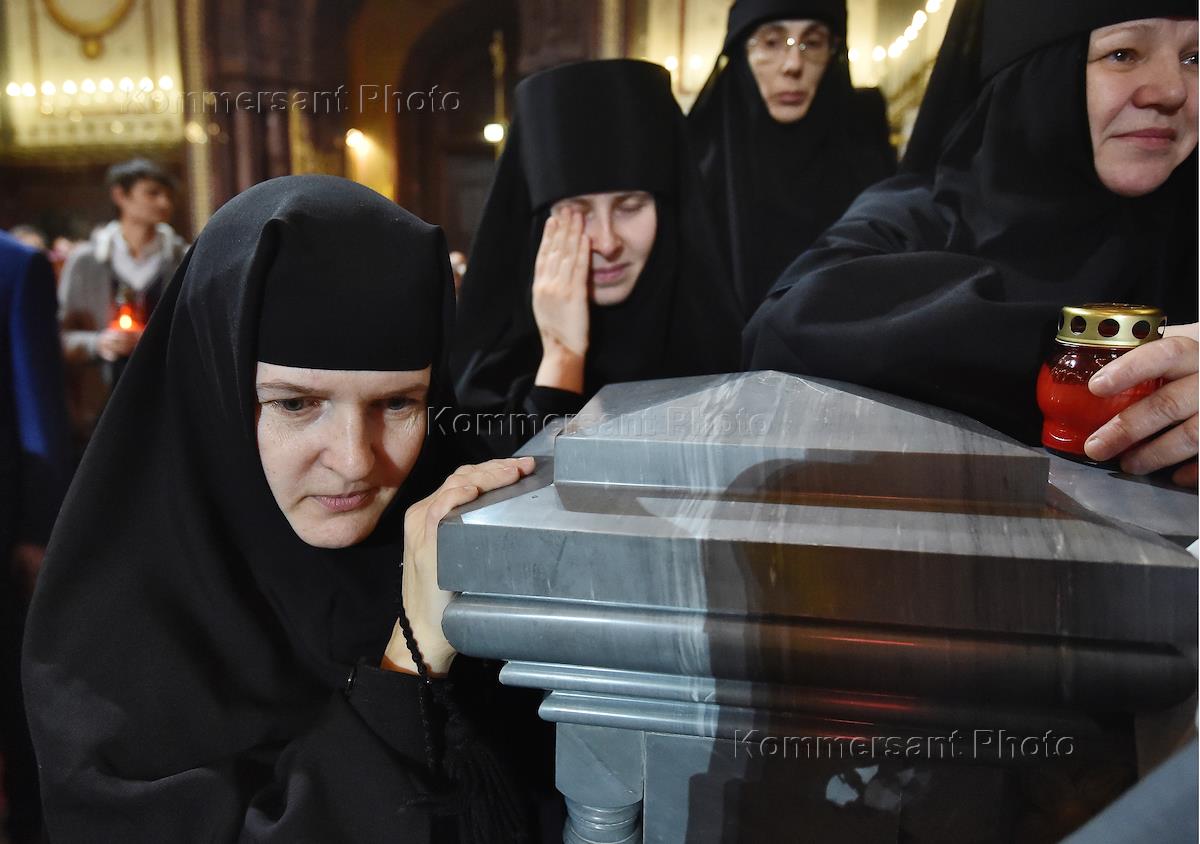 Пасхальная заутреня и Божественная литургия в кафедральном соборном храме Христа Спасителя. Монахини во время богослужения.