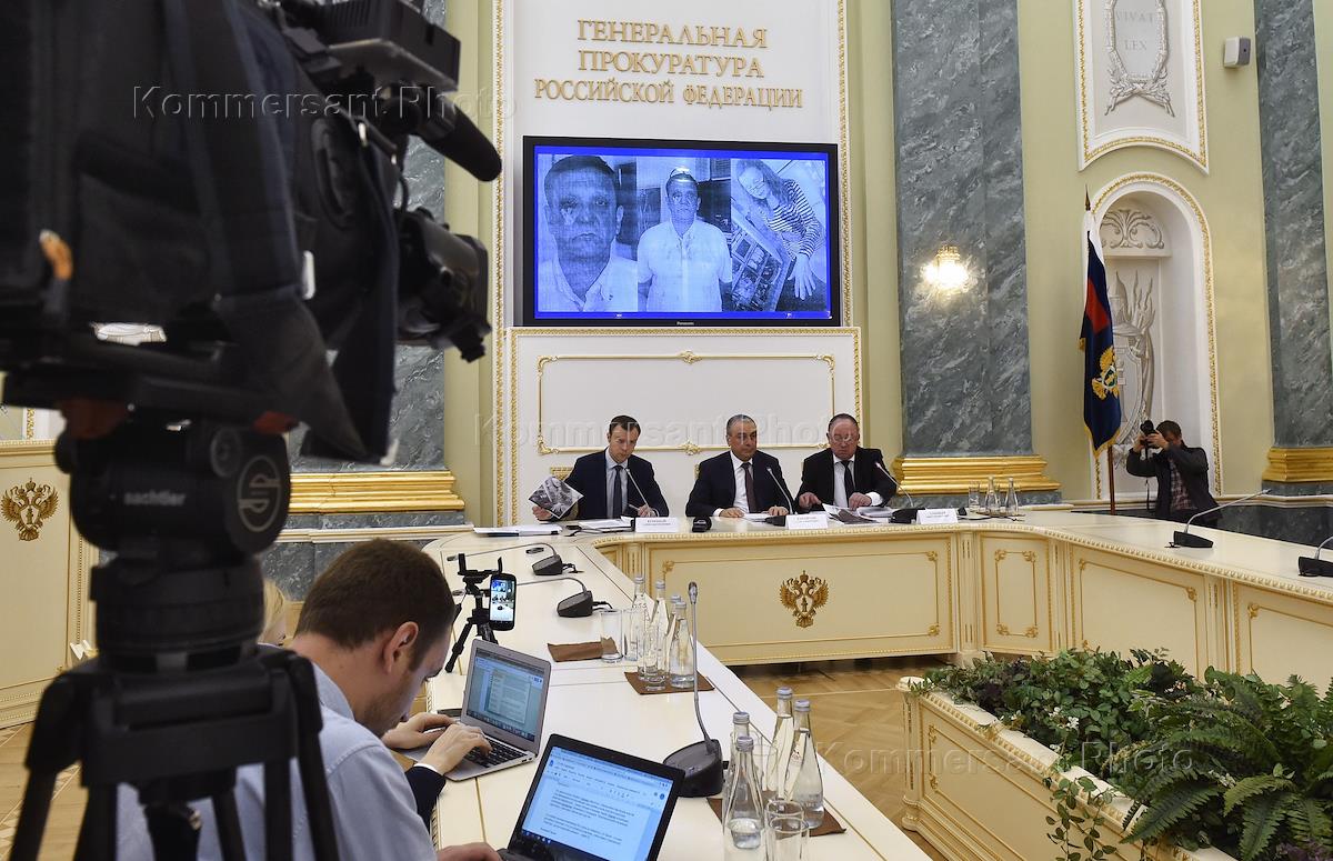 Официальный представитель Генеральной прокуратуры России Александр Куренной (слева), заместитель генерального прокурора России Саак Карапетян (в центре) и советник генерального прокурора России Николай Атмоньев (справа) во время брифинга Генеральной прокуратуры России.