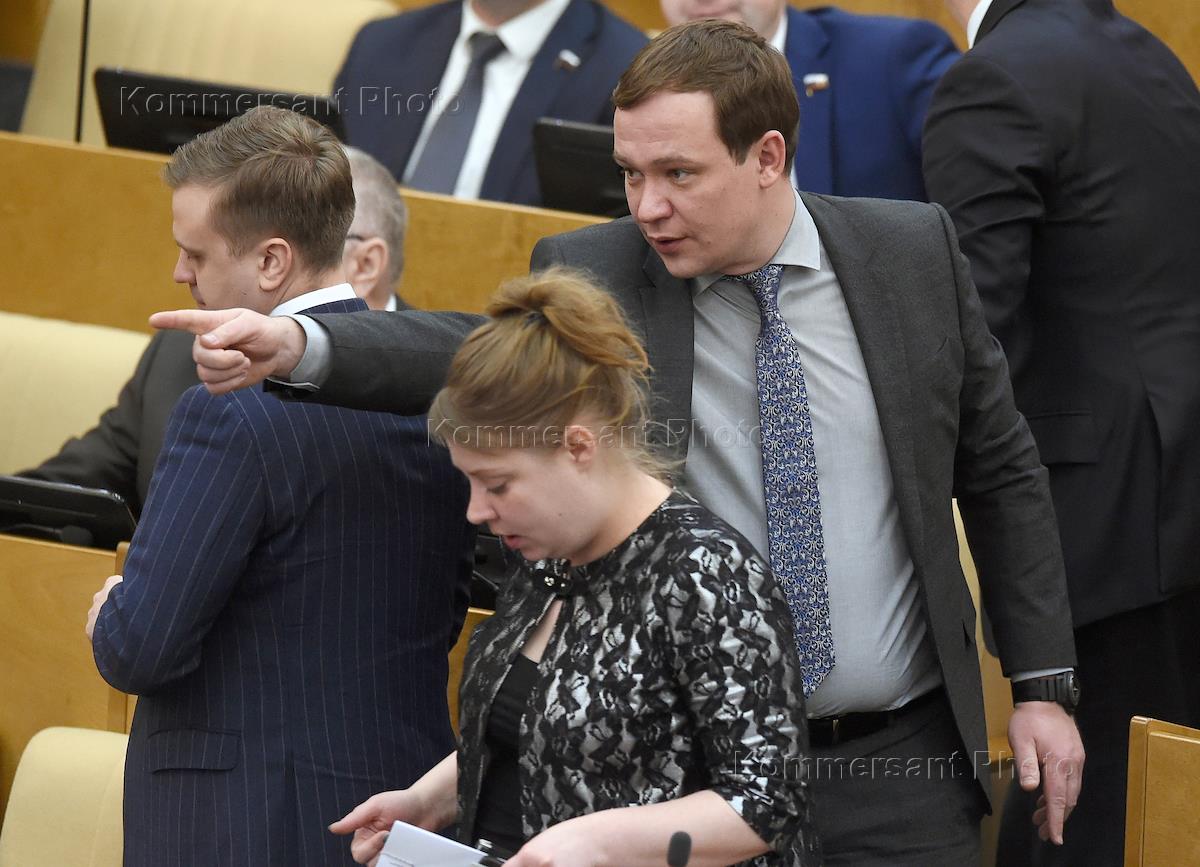 Пленарное заседание Государственной думы (ГД) России. Член комитета ГД России по финансовому рынку Данил Шилков (справа) во время заседания.