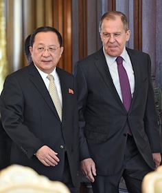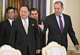 Переговоры министра иностранных дел России Сергея Лаврова с министром иностранных дел Корейской Народно-Демократической Республики (КНДР) Ли Ён Хо прошли в Доме приемов МИД России. Министр иностранных дел КНДР Ли Ён Хо (слева) и министр иностранных дел России Сергей Лавров (справа) перед началом переговоров.