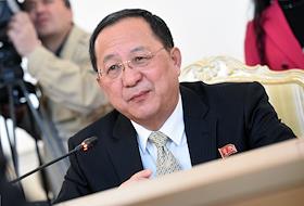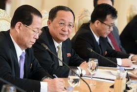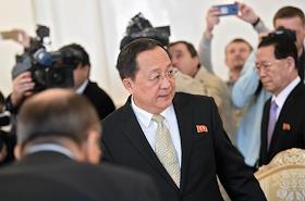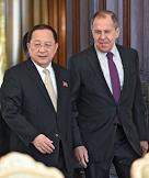 Переговоры министра иностранных дел России Сергея Лаврова с министром иностранных дел Корейской Народно-Демократической Республики (КНДР) Ли Ён Хо прошли в Доме приемов МИД России. Министр иностранных дел КНДР Ли Ён Хо (в центре) во время переговоров.