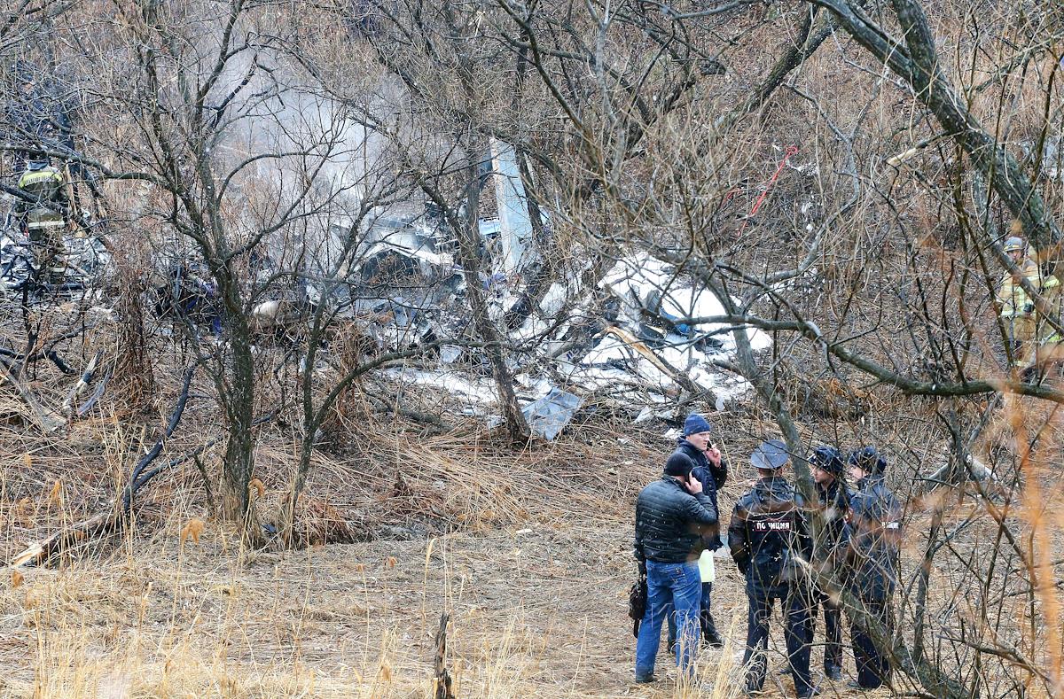 Сотрудники полиции и МЧС России на месте крушения вертолета Ми-8, авиакомпании "Восток". Вертолет совершал учебно-тренировочный полет, на борту находились члены экипажа - шесть человек, все погибли.