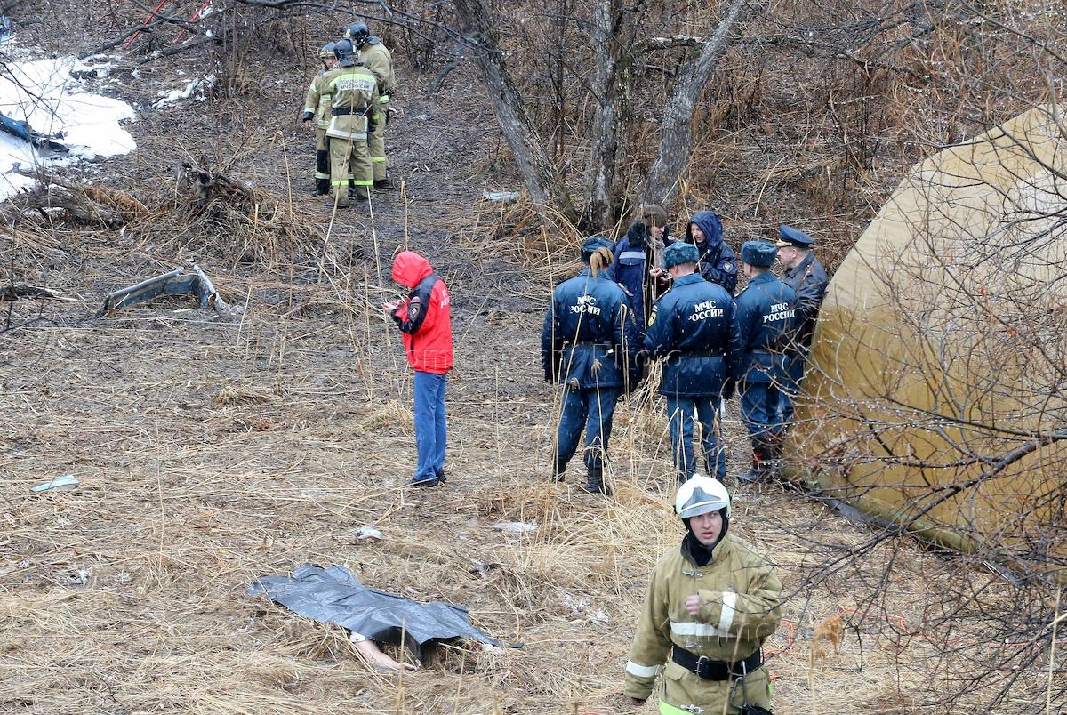 Сотрудники полиции и МЧС России на месте крушения вертолета Ми-8, авиакомпании "Восток". Вертолет совершал учебно-тренировочный полет, на борту находились члены экипажа - шесть человек, все погибли.