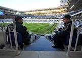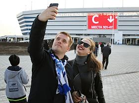Первый тестовый футбольный матч между командами "Балтика" (Калининград) и "Крылья Советов" (Самара) прошел на новом стадионе "Калининград-Арена". Болельщики делают селфи на фоне стадиона.