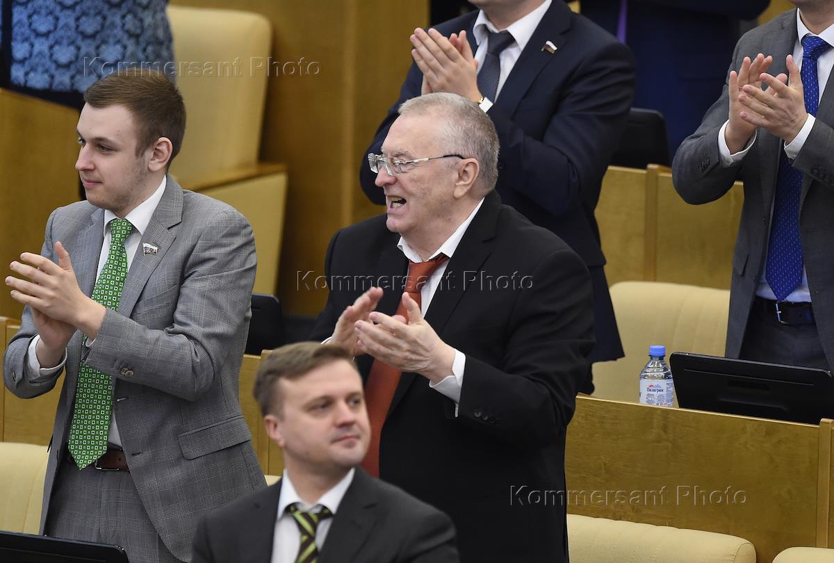 Пленарное заседание Государственной думы (ГД) России. Лидер Либерально-демократической партии России (ЛДПР) Владимир Жириновский (в центре) и член комитета ГД по физической культуре, спорту, туризму и делам молодежи Василий Власов (слева) во время заседания.