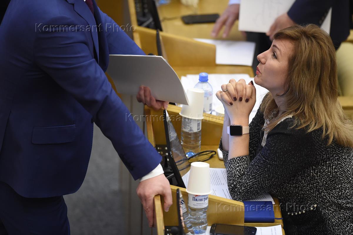 Пленарное заседание Государственной думы (ГД) России. Заместитель председателя ГД России Ольга Епифанова (слева) и полномочный представитель правительства России в ГД России Александр Синенко (справа) перед началом заседания.