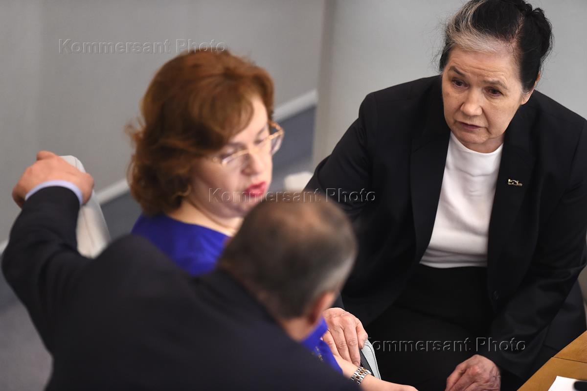 Пленарное заседание Государственной думы (ГД) России. Член комитета ГД по делам национальностей Зугура Рахматуллина (слева) во время заседания.