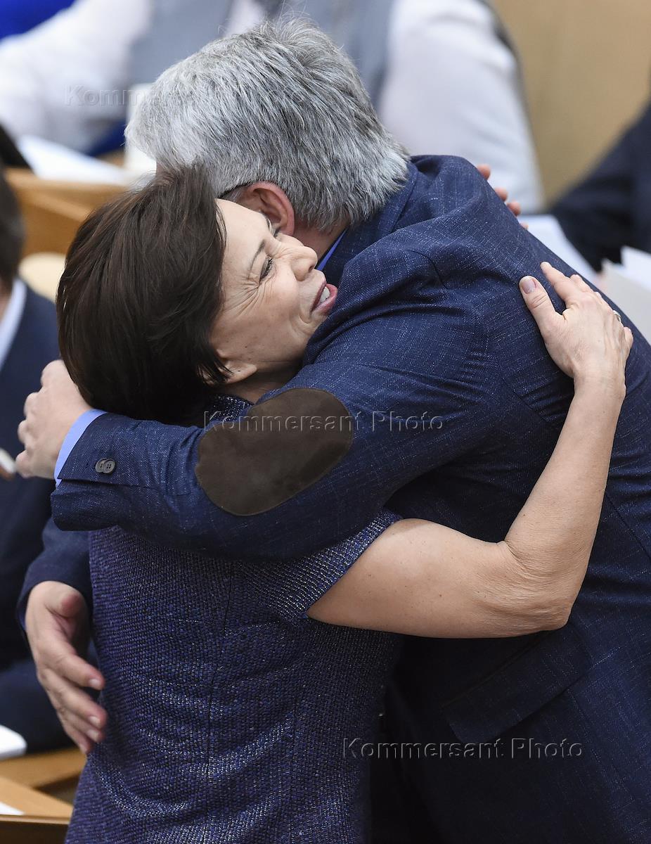 Пленарное заседание Государственной думы (ГД) России. Член комитета ГД России по физической культуре, спорту, туризму и делам молодежи Марат Бариев (справа) и член комитета ГД России по культуре Елена Бондаренко (слева) перед началом заседания.