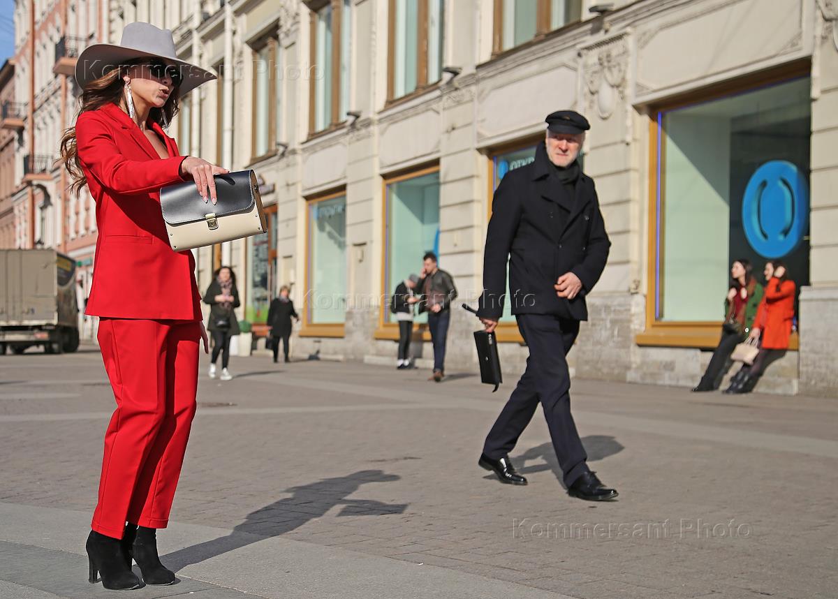 Жанровая фотография. Девушка в красном костюме танцует на Малой Конюшенной улице.