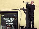 Жанровая фотография. Известный уличный трубач Невского проспекта дядя Миша играет на трубе.