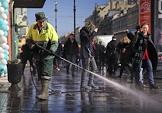 Жанровая фотография. Рабочий жилищно-коммунального хозяйства моет из шланга тротуар на Невском проспекте.