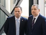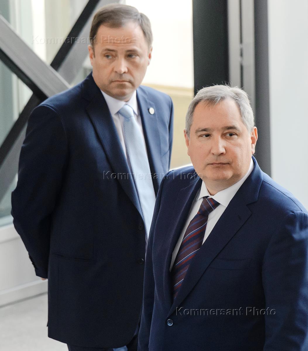 Церемония открытия реконструированного исторического павильона "Космос" на ВДНХ, на базе которого создан центр "Космонавтика и авиация". Генеральный директор государственной корпорации "Роскосмос" Игорь Комаров (слева) и заместитель председателя правительства России Дмитрий Рогозин (справа) во время церемонии.