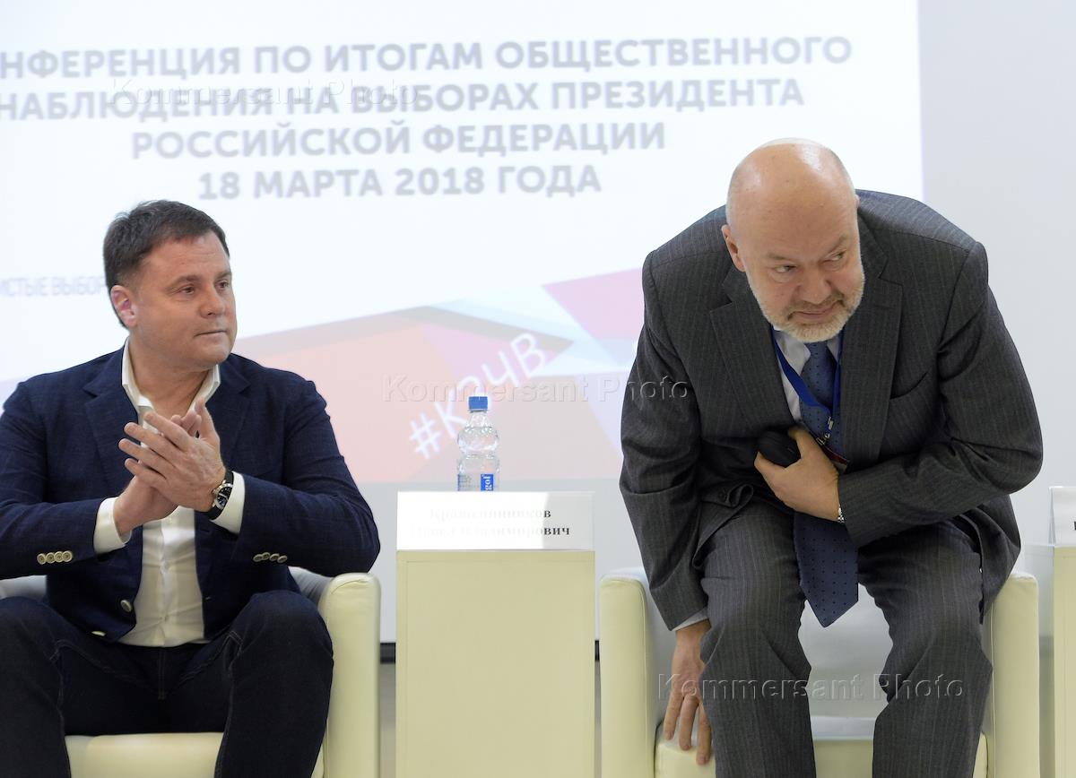 Конференция по итогам общественного наблюдения на выборах президента России 18 марта 2018 года прошла в Центральном доме туриста. Председатель правления Ассоциации юристов России Владимир Груздев (слева) и председатель комитета Государственной думы России по государственному строительству и законодательству Павел Крашенинников (справа) во время конференции.