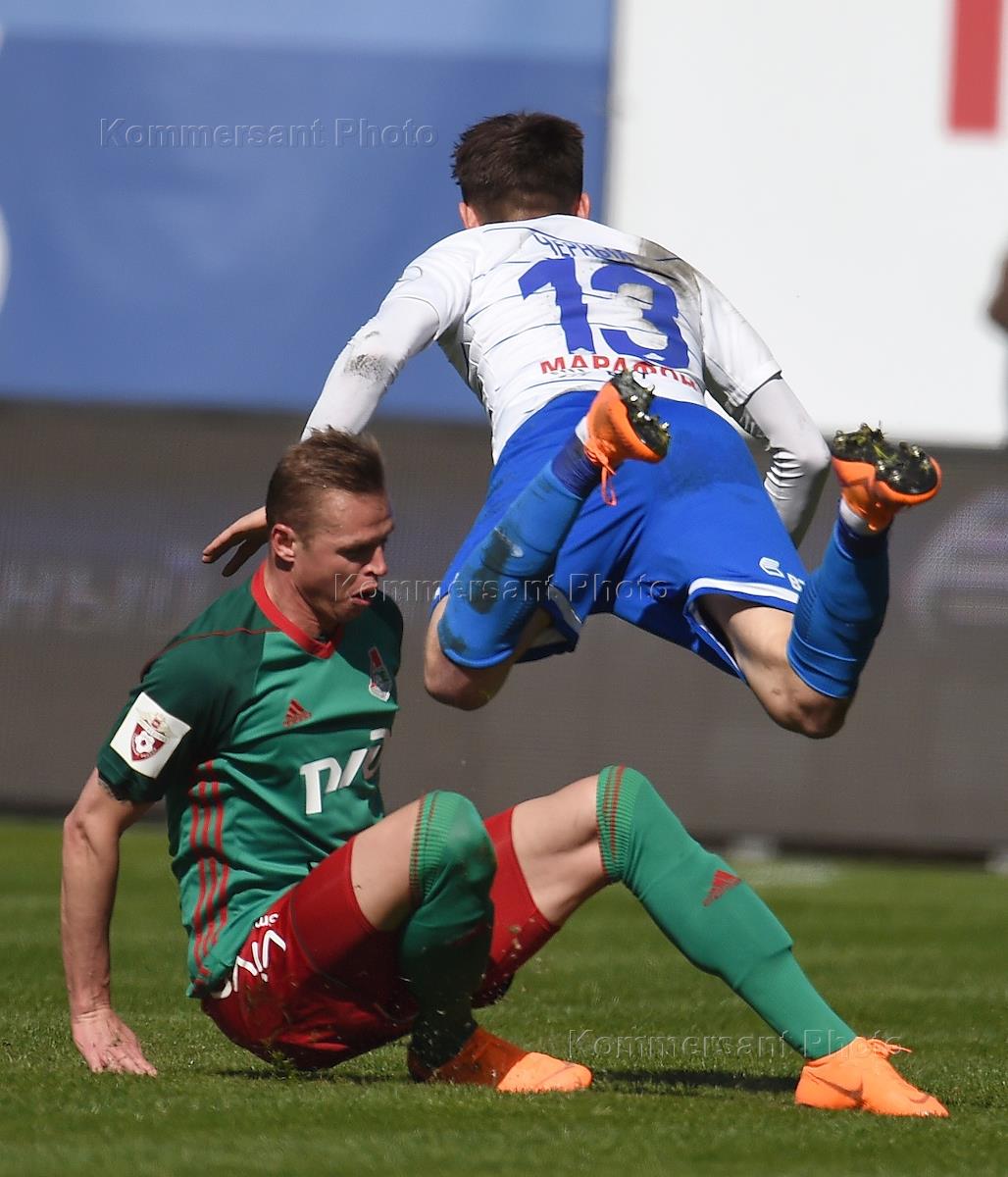 РОСГОССТРАХ - Чемпионат России по футболу 2017/2018. 26-й тур. Матч между командами "Динамо" (Москва) - "Локомотив" (Москва) прошел на стадионе "Арена Химки". Игрок команды "Локомотив" Игорь Денисов (справа) во время матча.