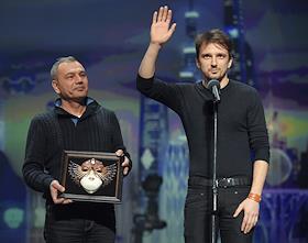 XXIV церемония вручения российской национальной театральной премии "Золотая Маска" прошла на новой сцене Большого театра. Актер Виталий Федоров (справа) и режиссер Константин Кучикин (слева), получившие специальную премию жюри драматического театра и театра кукол Хабаровскому театру юного зрителя "За тонкое и сценически выразительное прочтение повести Льва Толстого "Детство" средствами целостного актерского ансамбля", во время церемонии.