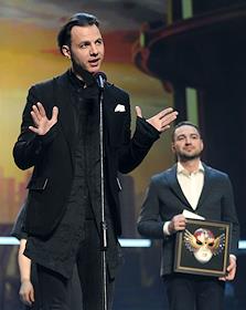 XXIV церемония вручения российской национальной театральной премии "Золотая Маска" прошла на новой сцене Большого театра. Режиссер Алексей Франдетти (справа), ставший лауреатом в номинации "Оперетта–мюзикл/работа режиссера" за спектакль "Суини Тодд, маньяк-цирюльник с Флит-стрит" Театра на Таганке, во время церемонии.