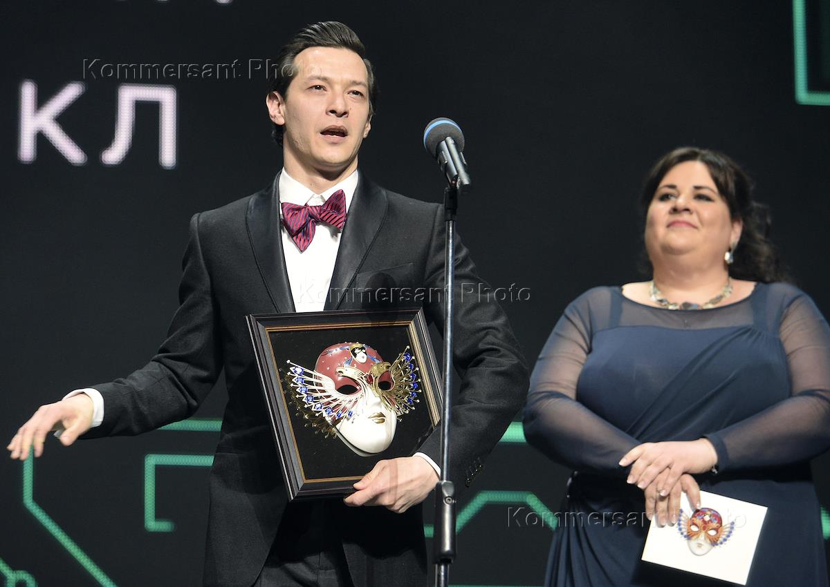 XXIV церемония вручения российской национальной театральной премии "Золотая Маска" прошла на новой сцене Большого театра. Лауреат российской национальной театральной премии "Золотая Маска" в номинации "Лучшая мужская роль в балете - современном танце" Нурбек Батулла (справа) во время церемонии .