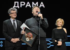 XXIV церемония вручения российской национальной театральной премии "Золотая Маска" прошла на новой сцене Государственного академического Большого театра (ГАБТ). Слева направо: президент премии и фестиваля "Золотая маска", актер Игорь Костолевский, режиссер Юрий Бутусов, ставший лауреатом в номинации "Драма/работа режиссера" за спектакль "Дядя Ваня" театра им. Ленсовета, и актриса Ингеборга Дапкунайте во время церемонии.