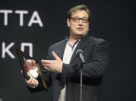 XXIV церемония вручения российской национальной театральной премии "Золотая Маска" прошла на новой сцене Государственного академического Большого театра (ГАБТ).Лауреат российской национальной театральной премии "Золотая Маска" в номинации "Драма. Работа драматурга" Дмитрий Данилов (справа) во время церемонии.