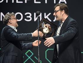 XXIV церемония вручения российской национальной театральной премии "Золотая Маска" прошла на новой сцене Большого театра. Лауреат российской национальной театральной премии "Золотая Маска" в номинации "Работа композитора в музыкальном театре" Алексей Сюмак (справа) во время церемонии.