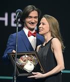 XXIV церемония вручения российской национальной театральной премии "Золотая Маска" прошла на новой сцене Большого театра. Режиссеры Ольга Шайдуллина (справа) и Антон Калипанов (слева), получившие приз в номинации "Куклы/спектакль" за спектакль "И дольше века длится день" Музея истории ГУЛАГа и Творческого объединения "Таратумб", во время церемонии.