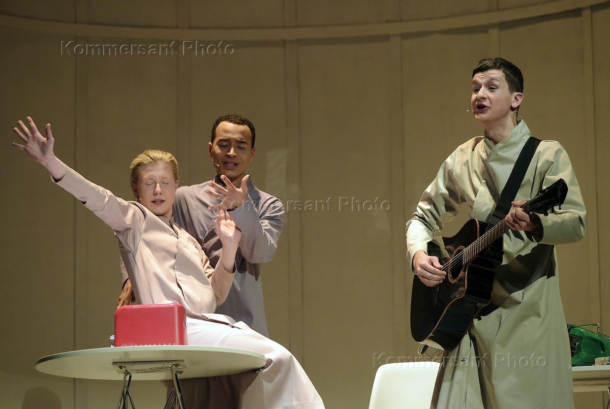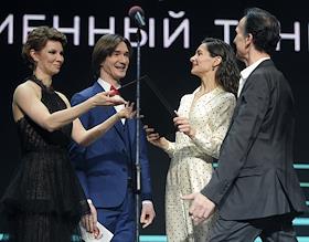XXIV церемония вручения российской национальной театральной премии "Золотая Маска" прошла на новой сцене Большого театра. Актер Виталий Федоров (слева) и режиссер Константин Кучикин (второй слева), получившие специальную премию жюри драматического театра и театра кукол Хабаровскому театру юного зрителя "За тонкое и сценически выразительное прочтение повести Льва Толстого "Детство" средствами целостного актерского ансамбля", во время церемонии.
