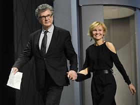 XXIV церемония вручения российской национальной театральной премии "Золотая Маска" прошла на новой сцене Государственного академического Большого театра (ГАБТ). Президент премии и фестиваля "Золотая маска", актер Игорь Костолевский (слева) и актриса Ингеборга Дапкунайте (справа) во время церемонии.