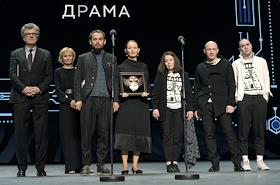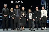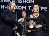 XXIV церемония вручения российской национальной театральной премии "Золотая Маска" прошла на новой сцене Большого театра. Режиссер Яна Тумина (вторая справа) и актер Александр Балсанов (справа), получившие приз в конкурсе "Эксперимент" за спектакль "Я Басе" "Упсала-цирка", во время церемонии.