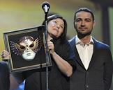 XXIV церемония вручения российской национальной театральной премии "Золотая Маска" прошла на новой сцене Большого театра. Режиссер Яна Тумина (вторая слева) и актер Александр Балсанови (слева), получившие приз в конкурсе "Эксперимент" за спектакль "Я Басе" "Упсала-цирка", во время церемонии.