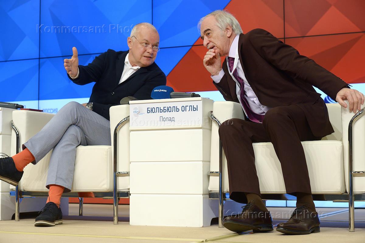 Четвертый Международный форум русскоязычных вещателей прошел в пресс-центре междунароного информационного агентства (МИА) "Россия сегодня". Телеведущий, генеральный директор МИА "Россия сегодня" Дмитрий Киселев (слева) и посол Азербайджана в России, композитор Полад Бюльбюль оглы (справа) на форуме.