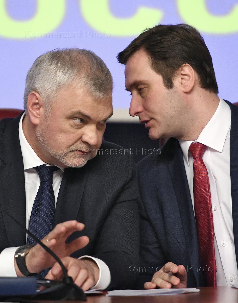 Расширенное заседание коллегии Федерального медико-биологического агентства с повесткой "Итоги работы ФМБА России в 2017 году и задачи на 2018-2019 годы" прошло в здании Федерального медико-биологического агентства (ФМБА). Руководитель Федерального медико-биологического агентства Владимир Уйба (слева) и заместитель министра здравоохранения России Олег Салагай (справа) во время заседания.