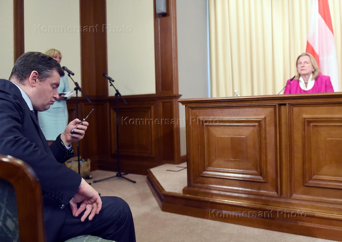 Встреча министра иностранных дел России Сергея Лаврова с министром иностранных дел Австрийской Республики Карин Кнайсль в Доме приемов МИД России. Председатель комитета Государственной думы России по международным делам Леонид Слуцкий во время встерчи.