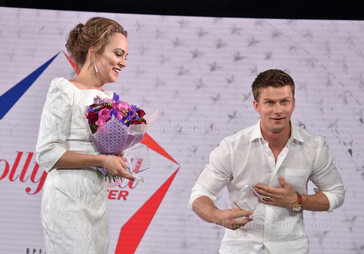 Ежегодная White Party и церемония вручения премии "Аванс" журнала The Hollywood Reporter в рамках 40-го Московского Международного кинофестиваля (ММКФ). Актеры Аглая Тарасова (слева) и Роман Курцын (справа) во время церемонии.