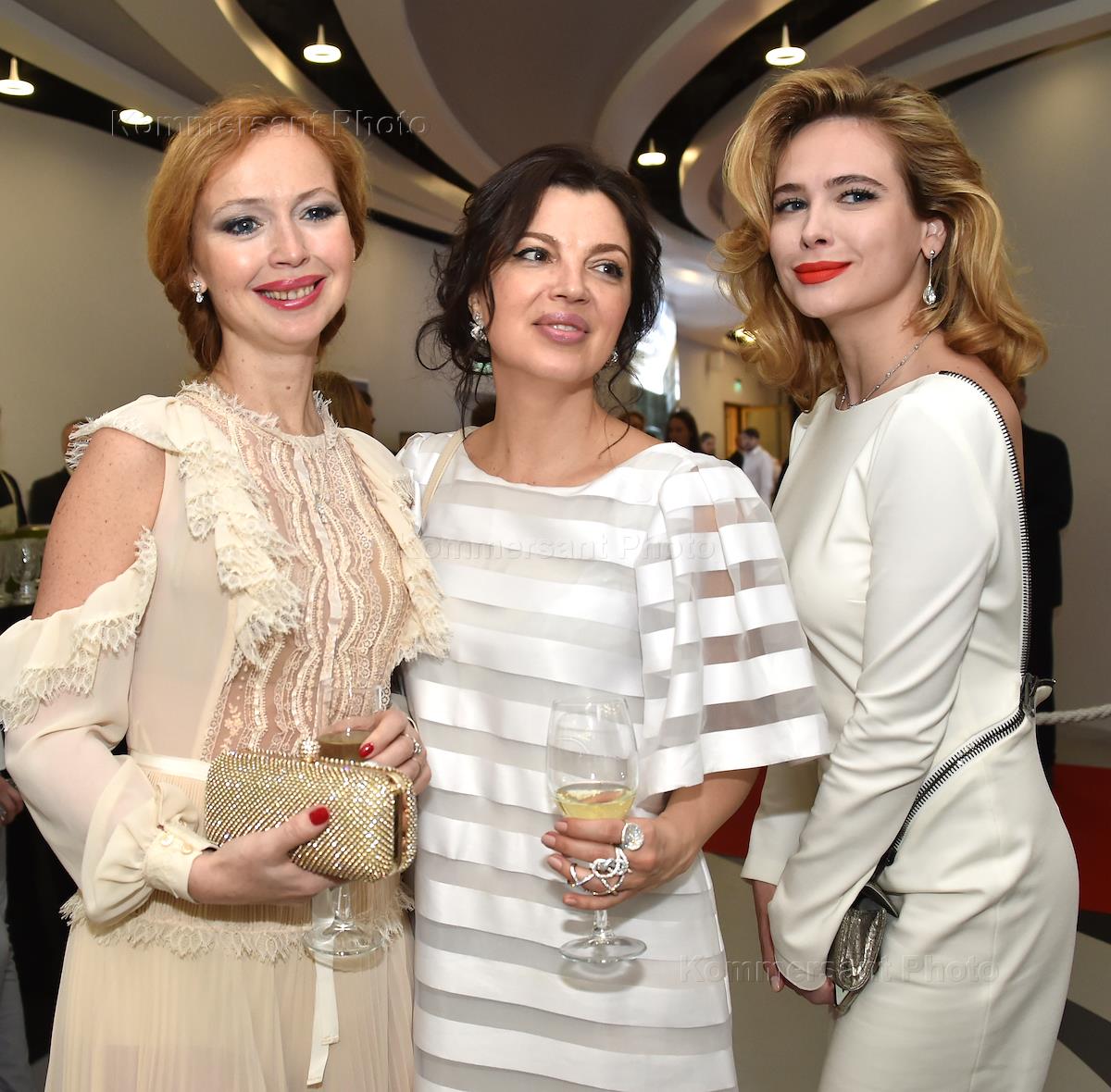 Ежегодная White Party и церемония вручения премии "Аванс" журнала The Hollywood Reporter в рамках 40-го Московского Международного кинофестиваля (ММКФ). Слева направо: актриса Елена Захарова, дизайнер Алиса Толкачева и актриса Анна Горшкова на вечеринке.
