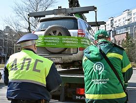 Жанровая фотография. Сотрудники службы "Московский паркинг" и сотрудник дорожно-патрульной службы (ДПС) эвакуируют направильно припаркованный автомобиль.