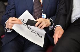 VI Российский международный энергетический форум прошел в конгрессно-выставочном центре "Экспофорум". Жанровая фотография. Участник форума с табличкой "reserved" в руках.