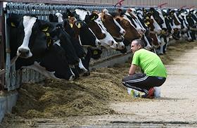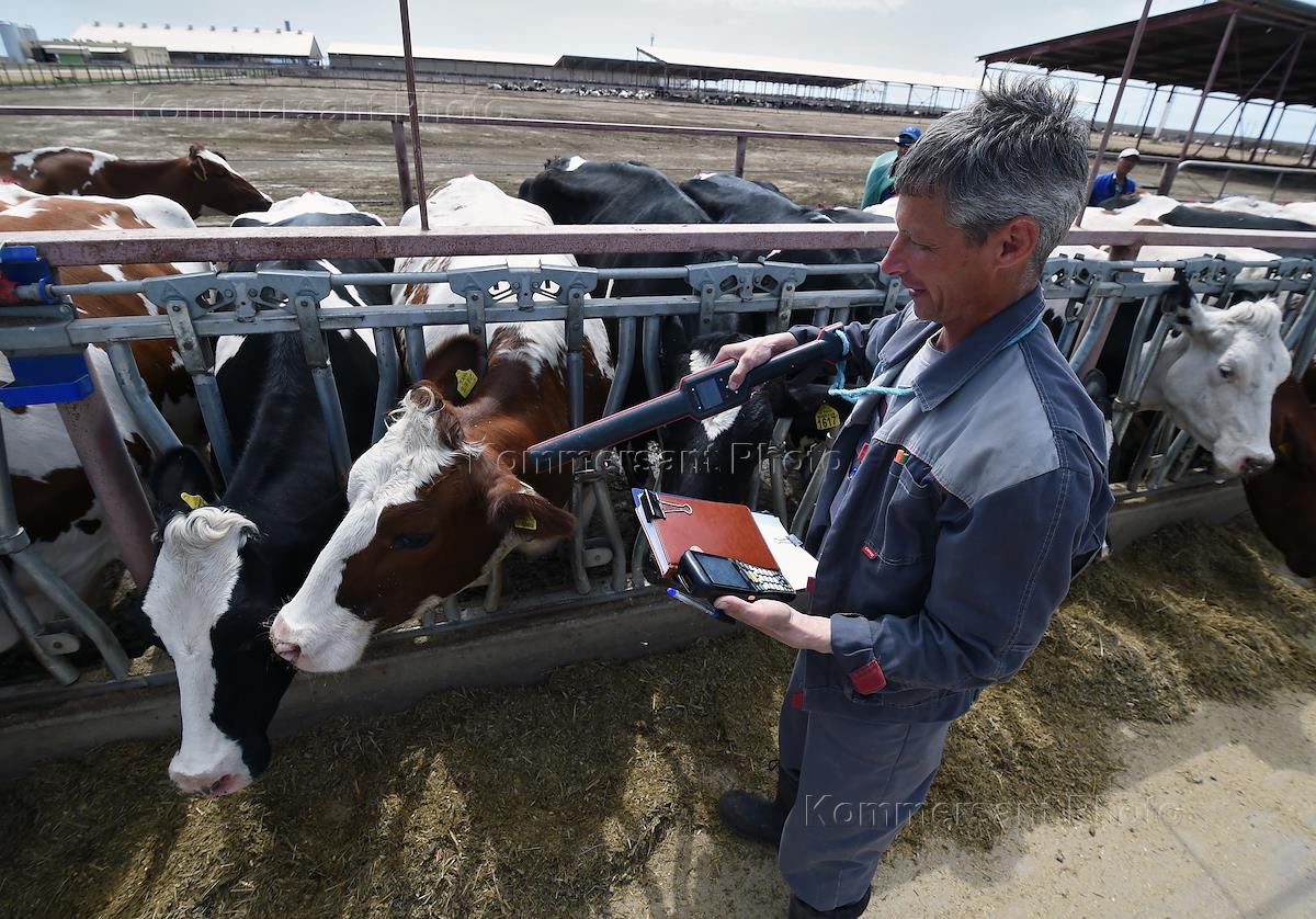 Молочный комплекс в селе Первомайское. Зоотехник во время осмотра коров.