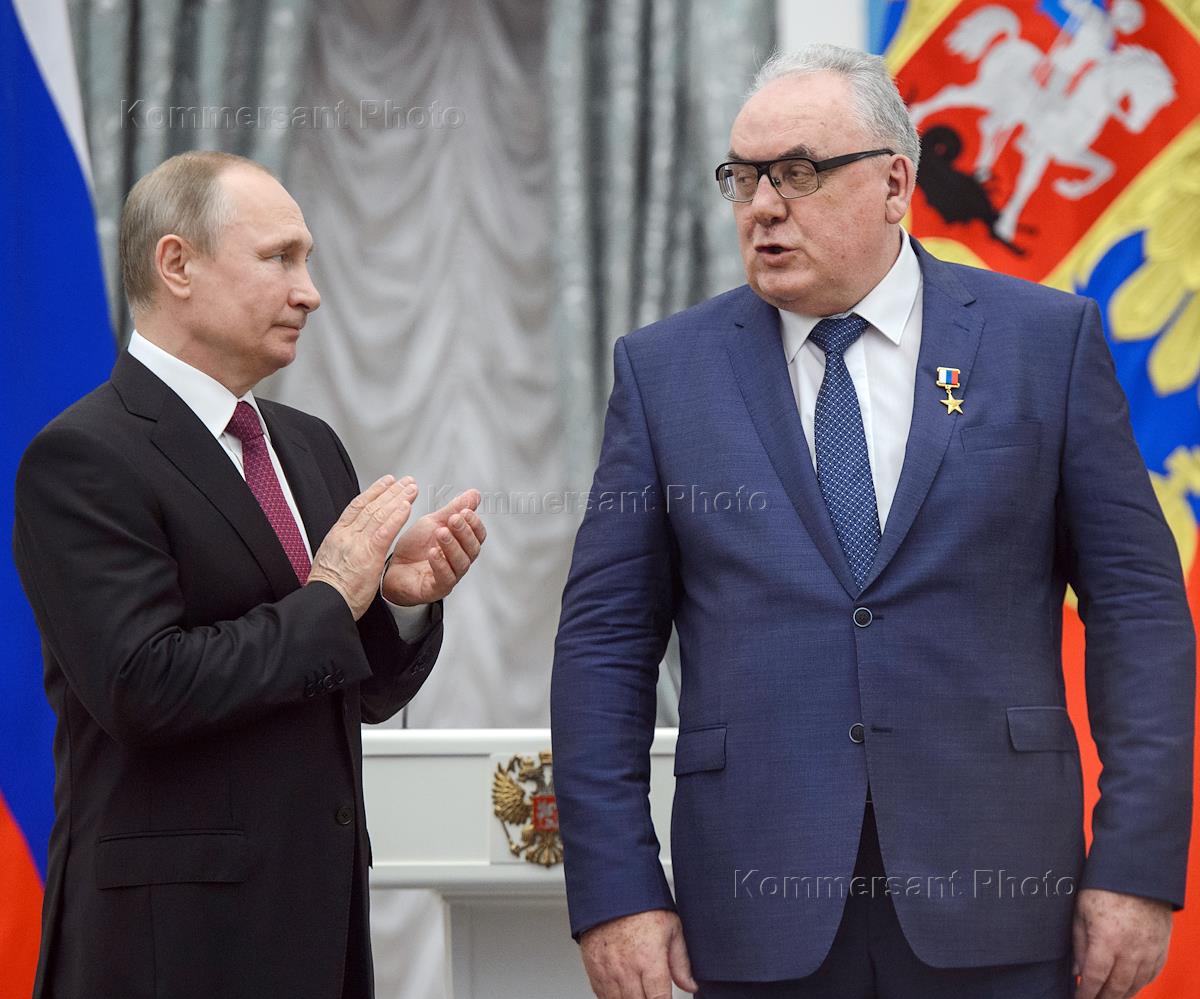 Президент России Владимир Путин на церемонии вручения медалей "Герой Труда Российской Федерации" в Кремле. Президент России Владимир Путин (слева) и генеральный директор АК "Туламашзавод" Евгений Дронов (справа) во время церемонии.