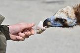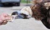 Жанровая фотография. Птица гриф старается ухватить клювом протянутую сторублевую купуюру.