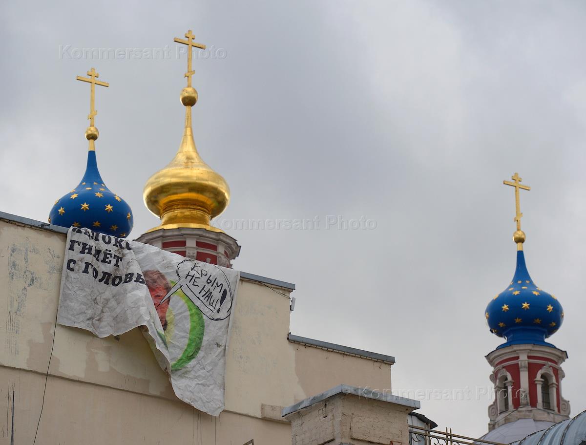 Жанровая фотография. Мятый грязный плакат на белой ткани "Яблоко гниет с головы, Крым не наш" на фоне церковных куполов.