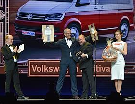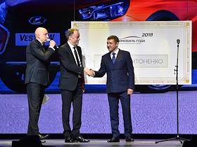 Церемония вручения ежегодной национальной премии "Автомобиль года в России 2018" в театре Московского Дворца Молодежи. Слева направо: главный редактор журнала "Автопарк" Михаил Ожерельев, глава марки "Volkswagen Коммерческие автомобили" Михаил Семенихин и генеральный директор "AVIS Россия" Алехандро Кареньо на церемонии.