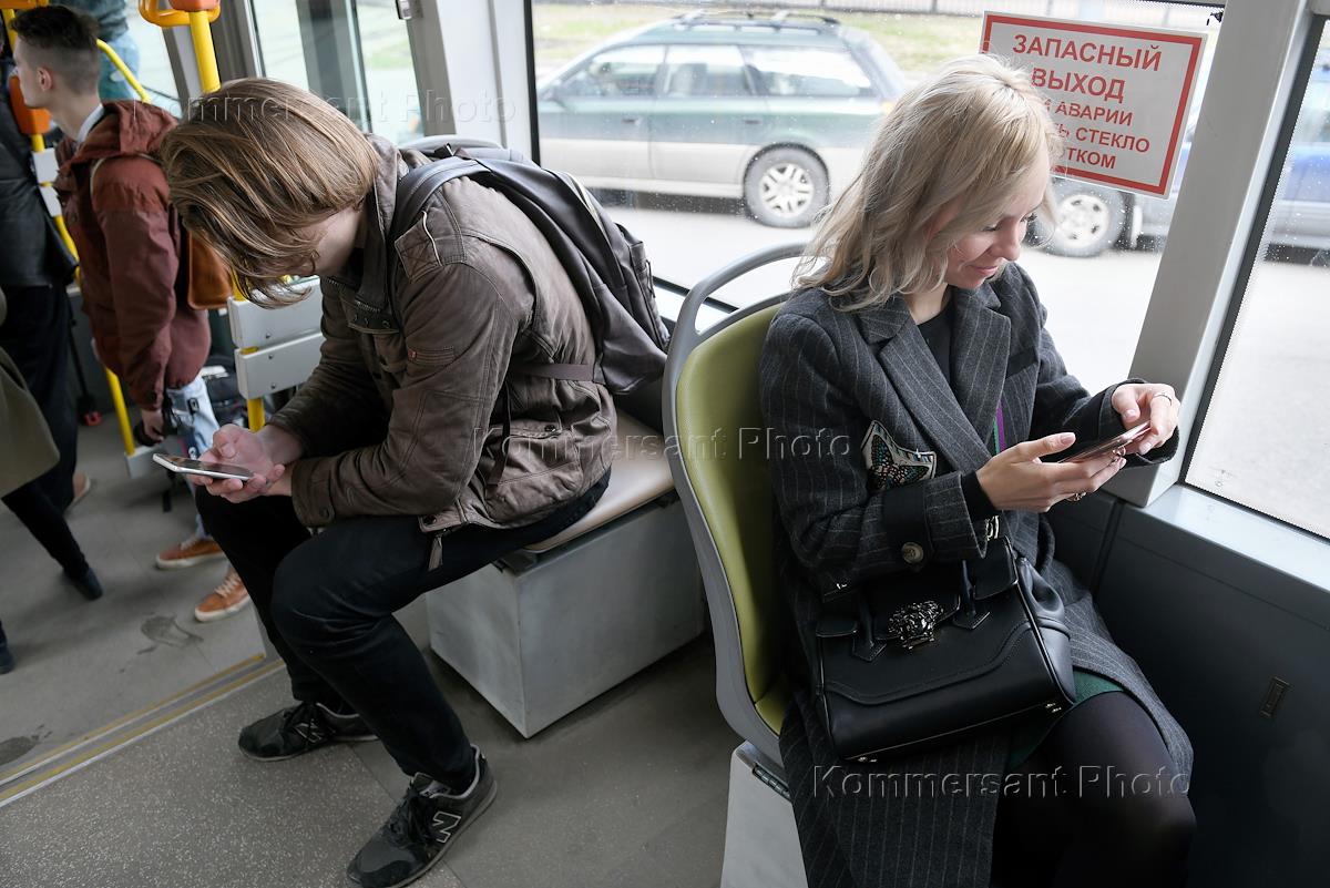 Жанровая фотография. Пассажиры трамвая со смартфонами в руках.