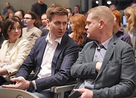 Церемония награждения лауреатов премии "Инновация 2018" прошла в Театре Наций. Продюсер Илья Бачурин (слева) и руководитель департамента культуры города Москвы Александр Кибовский (справа) во время церемонии.